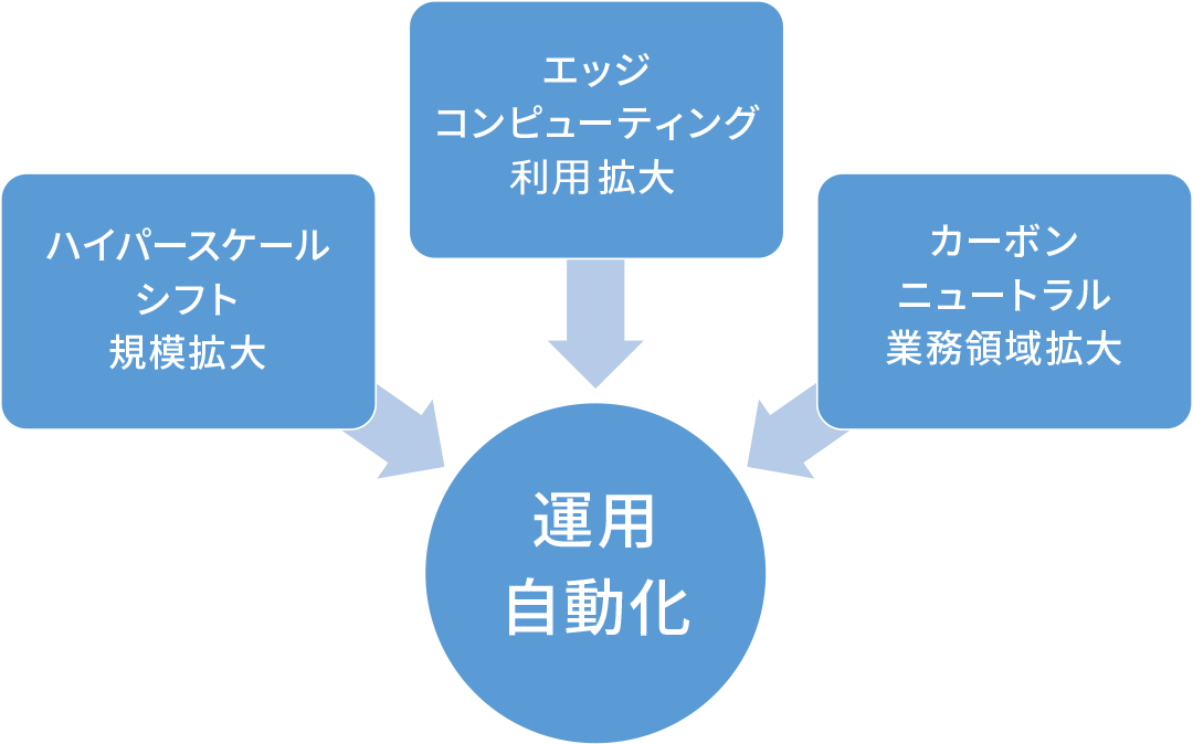 ハイパースケール化によってデータセンターの規模が拡大し、エッジコンピューティングで運用対象のデータセンターの数も増え、省エネ/再エネ化で発電/蓄電設備や再エネ価値(非化石証書等)管理などの業務領域も拡大するなか、限られた運用リソースで、データセンターを高い品質で運用していくためには、運用の自動化が必須です。