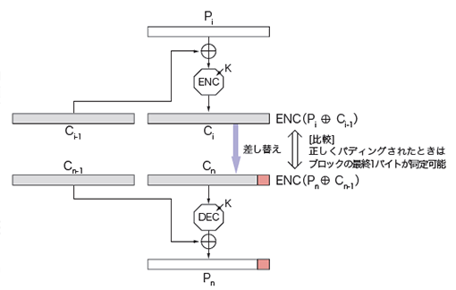 ※ 暗号文の1バイトを改ざんして復号処理した場合には、当該ブロックの平文はブロック全体に渡って影響が及ぶが、次ブロックにおける平文において意図した箇所を改ざんすることが可能である。