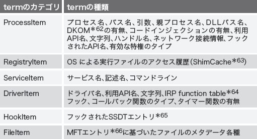 openioc_scanがサポートしているtermの一覧を表-1に示します。ProcessItemとDriverItemについては、スキャン対象となるプロセスやドライバは、個別にIOCの定義内容に対して真か偽かを評価されます。例えば、先の例のIOCは1つのプロセス内に閉じて評価されることになります。また、カテゴリの異なるtermを組み合わせた定義を行うことも可能ですが、組み合わせによってはパフォーマンスが著しく低下する場合があるので(※60)、定義内容はできるだけ1つのカテゴリのtermのみをシンプルに定義していくほうが良いでしょう。