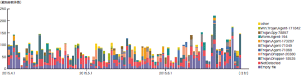 2015年4月から6月の期間に検知されたドライブバイダウンロードは、2015年1月から3月の期間の2倍以上に増加しています。前半はNeutrinoが多く観測されましたが、後半はほとんどNuclearへとシフトしています(図-12)。また、6月中旬の一時期、Sundownという新たなExploit Kitを検知しました。Sundownは特に日本国内のユーザを対象とした攻撃に用いられており(※41)、MITFにおける観測時には、CVE-2015-0311やCVE-2015-0313などのFlashの脆弱性を悪用して最終的にKasidetなどのマルウェアのダウンロードが発生したことを確認しました。