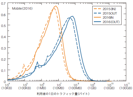 ブロードバンドのINとOUTの各分布は、片対数グラフ上で正規分布となる、対数正規分布に近い形をしています。これはリニアなグラフで見ると、左端近くにピークがあり右へなだらかに減少するいわゆるロングテールな分布です。OUTの分布はINの分布より右にずれていて、ダウンロード量がアップロード量より、ひと桁以上大きくなっています。2015年と2016年で比較すると、INとOUT共に分布の山が右に少し移動していて、利用者全体のトラフィック量が増えていることが分かります。右側のOUTの分布を見ると、分布のピークはここ数年間で着実に右に移動していますが、右端のヘビーユーザの使用量はあまり増えていないので、分布の対称性が崩れてきています。一方で、左側のINの分布は左右対称で、より対数正規分布に近い形です。