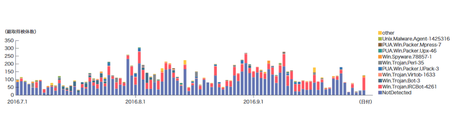 期間中の1日あたりの平均値は、総取得検体数が124、ユニーク検体数が20でした。未検出の検体をより詳しく調査した結果、台湾、インド、ベトナムなどに割り当てられたIPアドレスで複数のSDBOTファミリ(IRCボットの一種)やビットコインマイニングツールのダウンローダなどが観測されています。