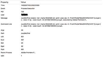 ここで、monitor.appのモニタリングを停止し、ログの調査を始めます。なお、ファイルメニューの「Save As...」を選択することで、ログをファイルとして出力することも可能です。また、実行前にデスクトップに置かれていたファイルはパスフレーズ付きZIPアーカイブとして保存されていることが確認できます(図-18)。