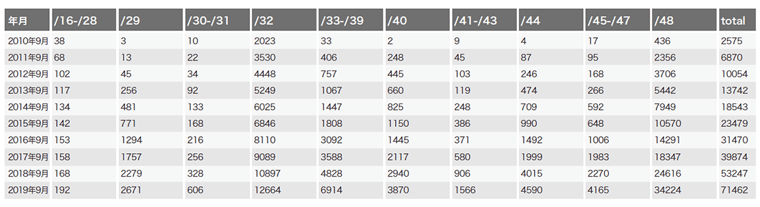次に「IPv6 フルルート」の情報を確認します(表-3)。経路総数は昨年よりも大きな伸びを示し7万を超えました。ただし分割広報された経路が全体の過半数を占める状況は変わっておらず、割り振り/割り当てサイズとしてはあまり見ることのないプレフィクス長"/30-/31"、"/41-/43"、"/45-/47"が昨年からの増加率トップ3となっています。
