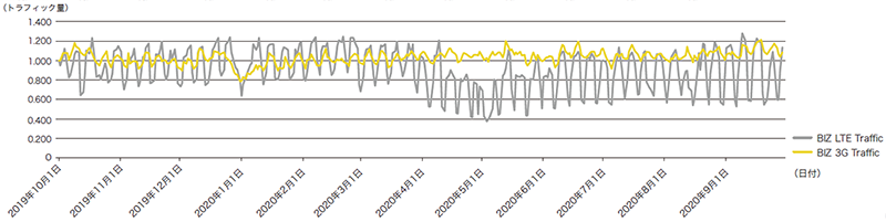 また、LTEのトラフィック傾向ですが、セッション数では3Gと同様に自粛期間中の落ち込みはあるものの、断続的な増加傾向にあります。またトラフィック量に関しても自粛期間である2020年4月〜5月を底として、いまは徐々に戻ってきている状況にあります。