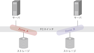 次にFCについて説明すると、FC-SANを流れるプロトコルはイーサネットで使うプロトコルではなくストレージに特化されたプロトコルのみで、FC-SANの目線で見ると各サーバ間のセキュリティは保たれます。また、FCのセキュリティを高める方法として、図-3のようにストレージ(ターゲット)とサーバ(イニシエータ)を紐付けるゾーニングという機能を用いて、他システムが利用するストレージへのアクセスを遮断する方式を取っています。またイーサネットとは異なり、複数システムで単一のストレージを共有する場合は図-4のようにそれぞれのゾーニングを設定すれば良いだけなので、アレイシステムの選択に苦慮しません。他にFC-SANを使うと、サーバとストレージの間のIPアドレス設計が不要になることでしょうか。