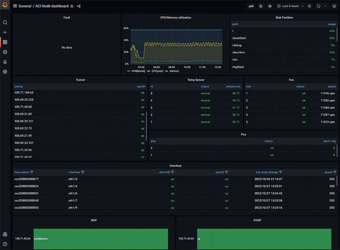 VXでのNFV基盤利用が加速すると設備の監視や利用状況のモニタリングも重要となります。今までのバックボーンネットワーク機器はICMP echoによる死活監視、SNMPによる情報取得やトラップ受信による監視が一般的でしたが、VXではそれらに加えてmetricsを利用したネットワーク状況のモニタリングや情報の可視化の有効化と利用者目線でネットワーク品質を監視できる仕組みを導入しました。metricsの取得と保管については昨今広く利用され始めているオープンソースのPrometheusを利用しています。Cisco ACIもmetrics取得のための監視エージェントに対応しており、簡単に時系列データを取得することができました。また監視エージェントで取得できないデータについても、特定のデータフォーマットで時系列データを作成することでデータを簡単に取り込めるexporterもPrometheusで用意されているため、様々なデータをPrometheus上で扱うことが可能です。集めたmetricsはオープンソースの可視化ツールであるGrafanaを用いてDashboard形式でデータを可視化してネットワークの正常性確認が簡単に行えるようになっており、モニタリング結果が特定のしきい値を下回ったりすればアラートとして検出、通知できるように社内の監視システムと連携を行っています。モニタリングは機器の正常性やエラーだけではなく、ネットワークの帯域利用状況や接続可能インタフェースなどのサービスキャパシティ情報も可視化データとして取り込んでおり、キャパシティ確認の自動化を行えるような取り組みもPrometheus+Grafana利用で実現しています。