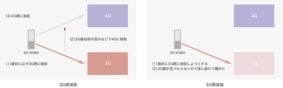3G網と4G網の両方が使えている状態であれば、最初に3G網に接続し、しばらくすると4G網に切り替わる程度の問題で済んでいましたが、3G停波後は3G網がないため、4G網に接続できない原因となります(図-3)。