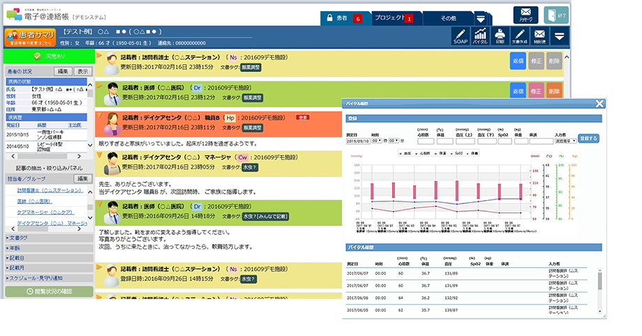 患者様ごとの掲示板(タイムライン)がベースになっていて、さまざまな専門職がSNSに投稿するような感覚でコメントを追加でき、医療画像やドキュメントファイルもアップロードが可能です。画面設計では、随所に医師の視点はもちろん多くの専門職の意見を頂き、さまざまな機能が盛り込まれています。