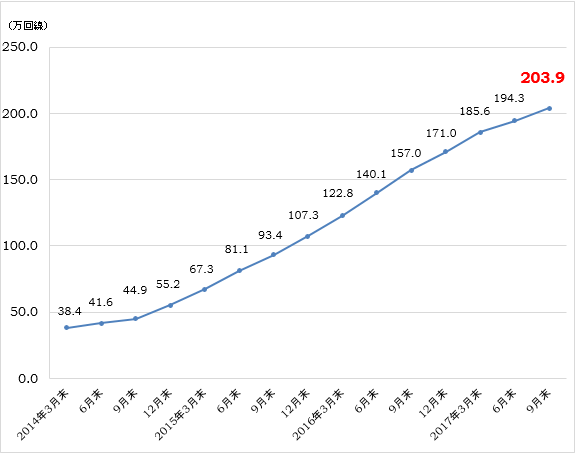 株式会社インターネットイニシアティブ(IIJ、本社:東京都千代田区、代表取締役社長:勝 栄二郎、コード番号:3774 東証第一部)は、MVNO事業として展開しているモバイルサービスの総回線数が、2017年9月末日時点で200万回線を超え、203.9万回線に達したことを発表いたします。