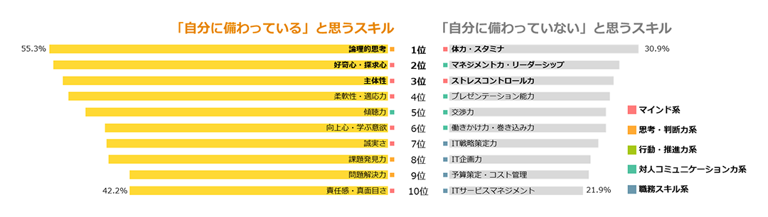 備わっているスキルとして、「マインド系」 や「思考・判断力系」が上位に多い傾向